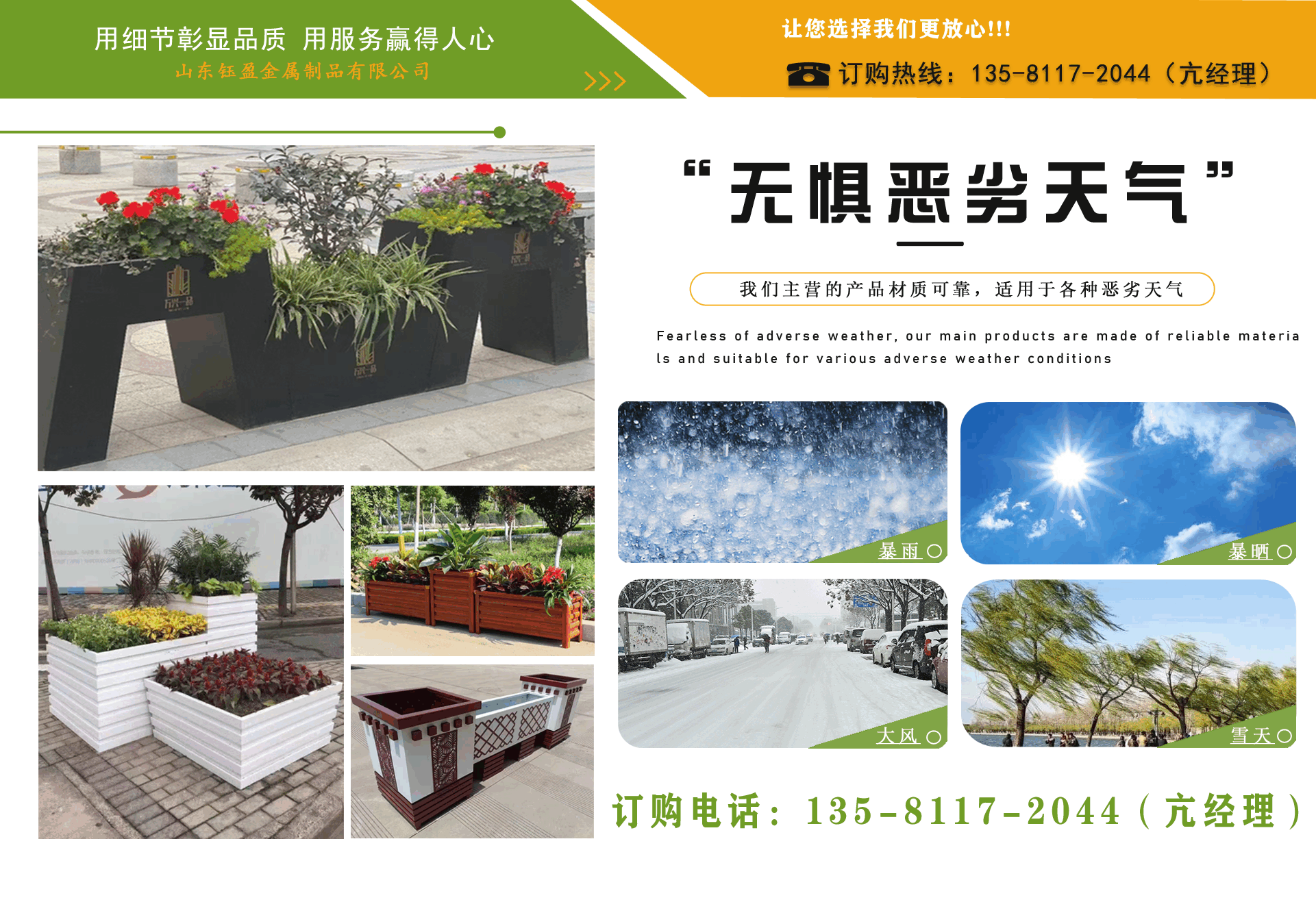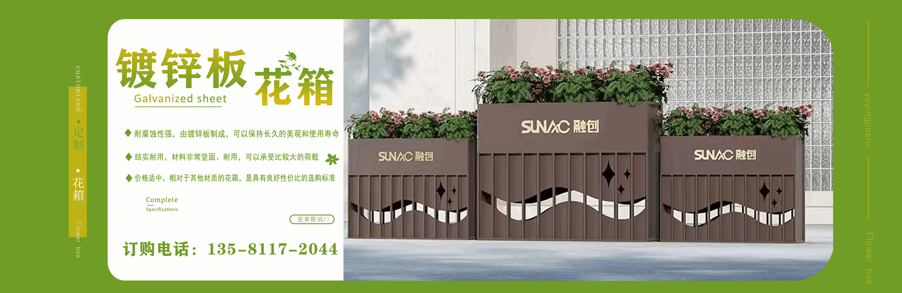 山東鈺盈金屬制品有限公司主營(yíng)鍍鋅板花箱,道路隔斷花箱,定制花箱,戶外道路花箱,花箱座椅等產(chǎn)品,產(chǎn)品結(jié)構(gòu)合理、性能優(yōu)良,具有強(qiáng)度高、耐腐蝕、抗老化、隔熱隔音、節(jié)約能源、外形美觀、使用壽命長(zhǎng)等優(yōu)點(diǎn),深受?chē)?guó)內(nèi)外客戶認(rèn)可。 我們根據(jù)客戶所在城市的文化特征,制造出符合當(dāng)?shù)爻鞘形幕瘹庀⒌淖匀涣Ⅲw、觀賞性強(qiáng)的花箱產(chǎn)品成為城市里一道靚麗的風(fēng)景線。 公司實(shí)行誠(chéng)實(shí)、公正、守信、價(jià)格合理、平等互利。 公司憑借雄厚經(jīng)驗(yàn)實(shí)力,恪守誠(chéng)信為本的原則,得到了眾多客戶的信賴,并在業(yè)界獲得良好的口碑。建立了穩(wěn)固的合作關(guān)系,隨著業(yè)務(wù)的不斷發(fā)展和壯大,合作伙伴的范圍也在不斷擴(kuò)大。我們熱情盼望與您的合作,為社會(huì)的可持續(xù)發(fā)展獻(xiàn)上一份努力。...